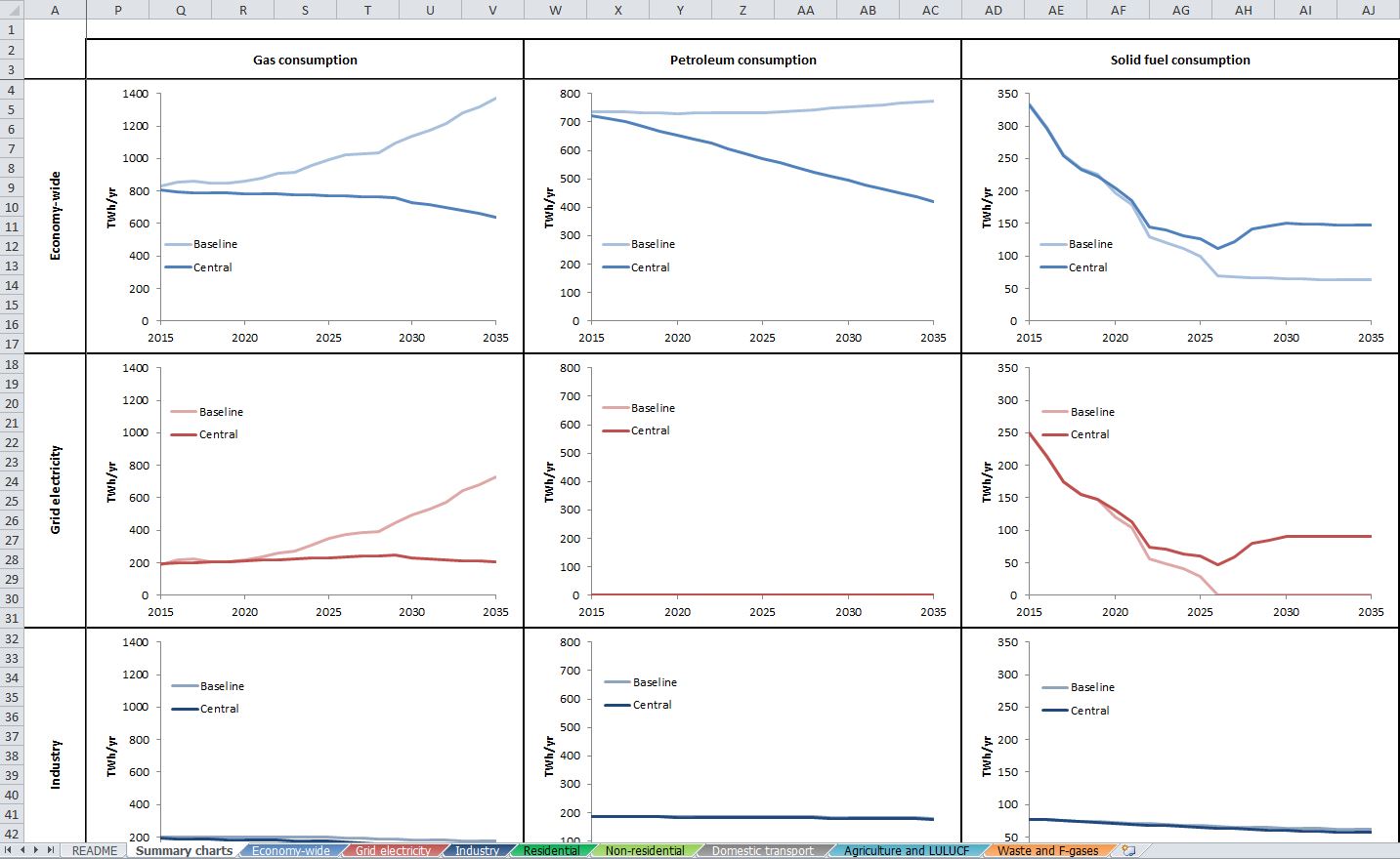 • Emissions and fuel consumption for both the ‘Central’ carbon budget scenario and a ‘Baseline’ scenario (which assumes no action beyond policies existing in 2008, before carbon budgets began).